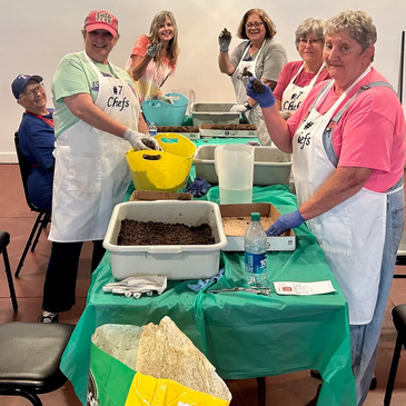 Avinger Chamber of Commerce members make wildflower seed balls using enriched soil, cat litter and wildflower seeds.
